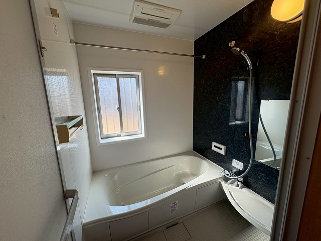 浴室はアクセントカラーの壁面を取り入れた、落ち着きのあるデザインを採用。